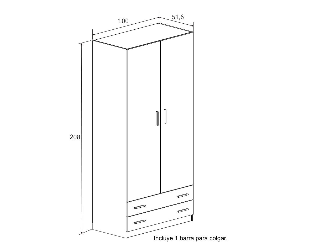 - Armario: alto 208 cm, ancho 100 cm, fondo 51,6 cm.