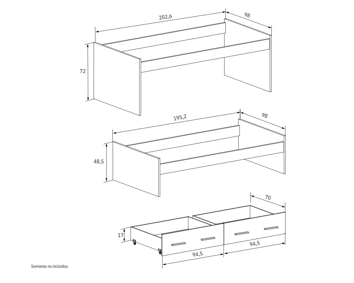 - Cama compacto: alto 72 cm, ancho 202,6 cm, fondo 98 cm.