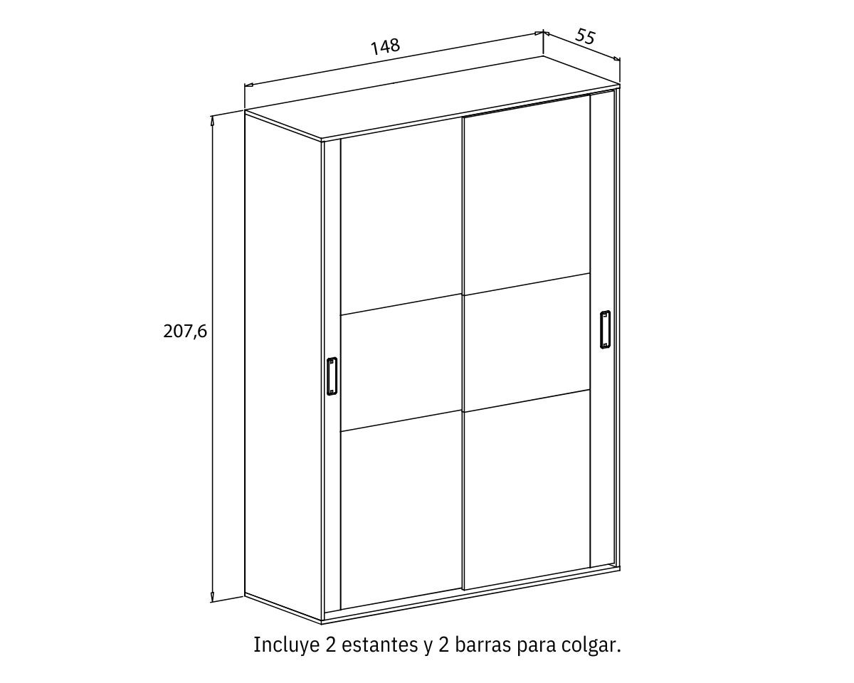 - Armario 2pc: alto 207,6 cm, ancho 150 cm, fondo 55 cm.