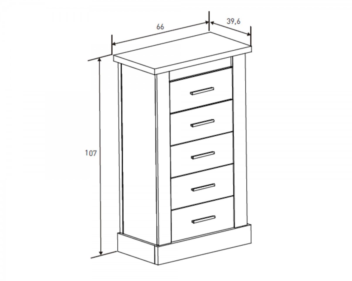 - Sinfonier 5 cajones: alto 107 cm, ancho 66 cm, fondo 39,6 cm.