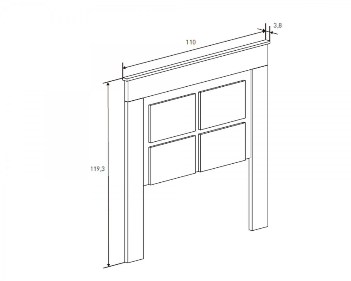 - Cabecero con patas: alto 119,3 cm, ancho 110 cm, fondo 3,8 cm.
