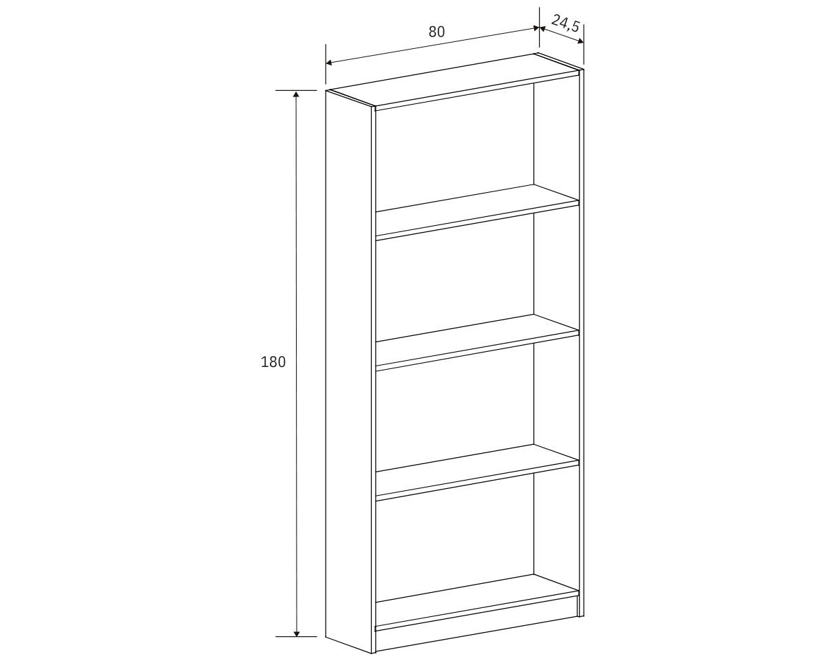 - Estantería: alto 180 cm, ancho 80 cm, fondo 24,5 cm.