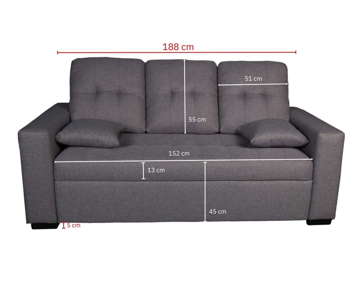 - Sofá: alto 96 cm, ancho 188 cm, fondo 82 cm.