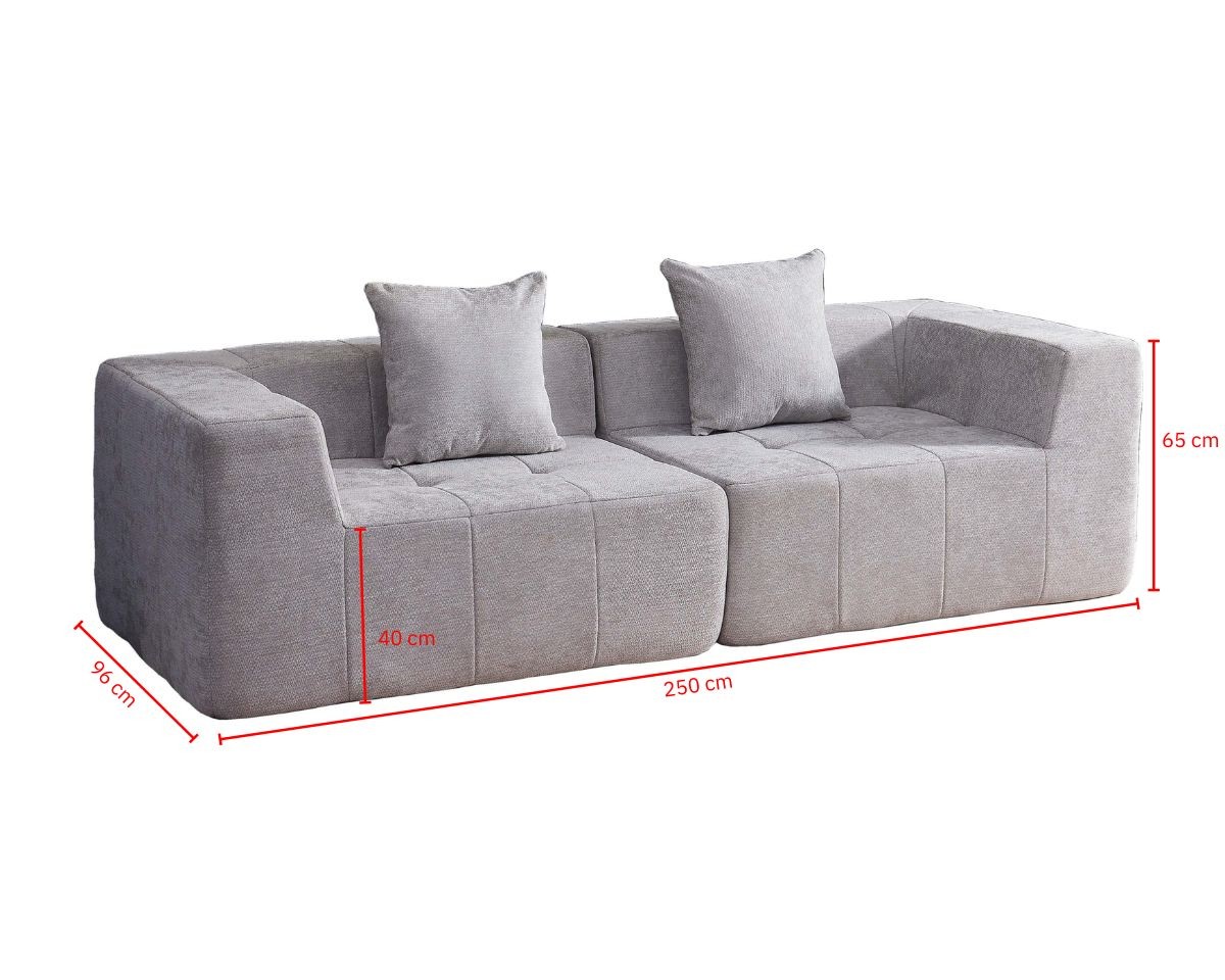 - Sofá: alto 65 cm, ancho 250 cm, fondo 96 cm.