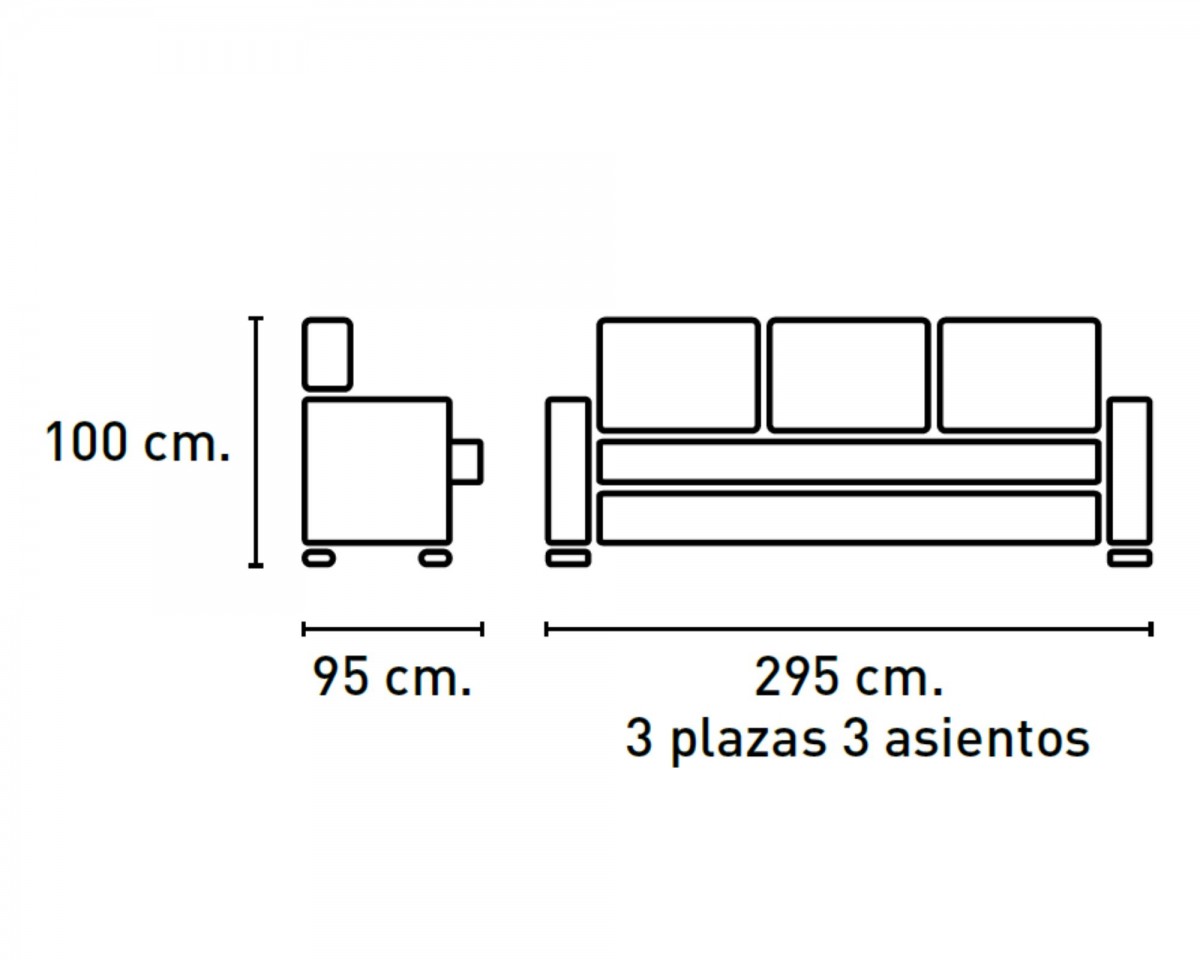 Sofá 3pl/3as : ancho 295 cm, alto 100 cm, fondo 95 cm.